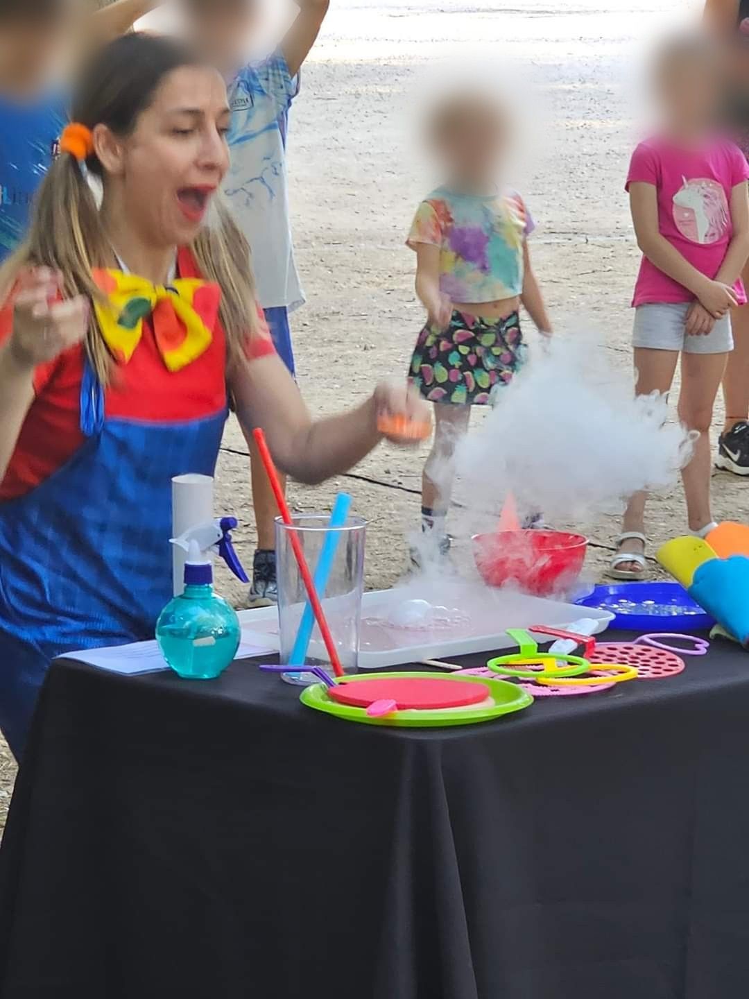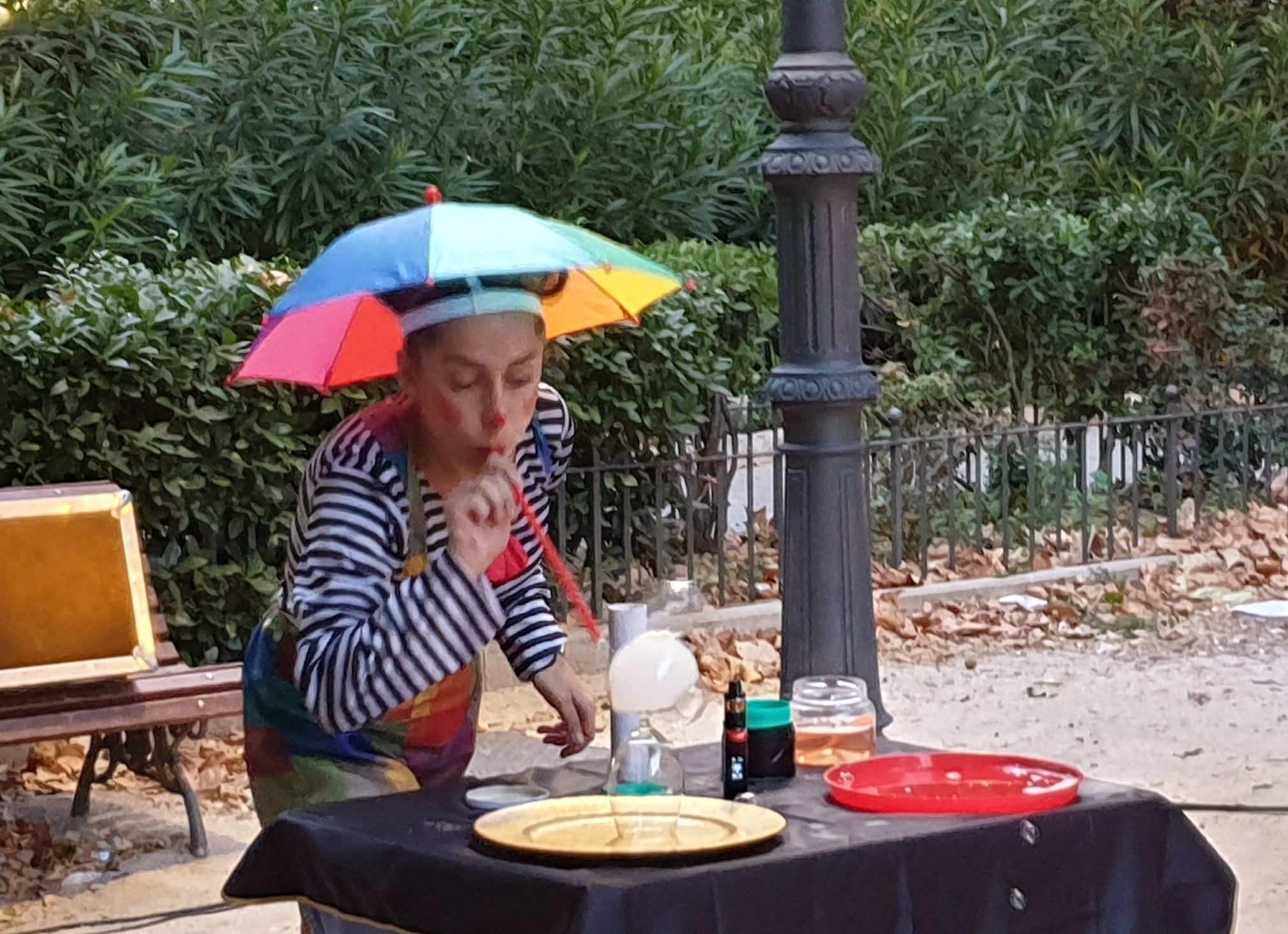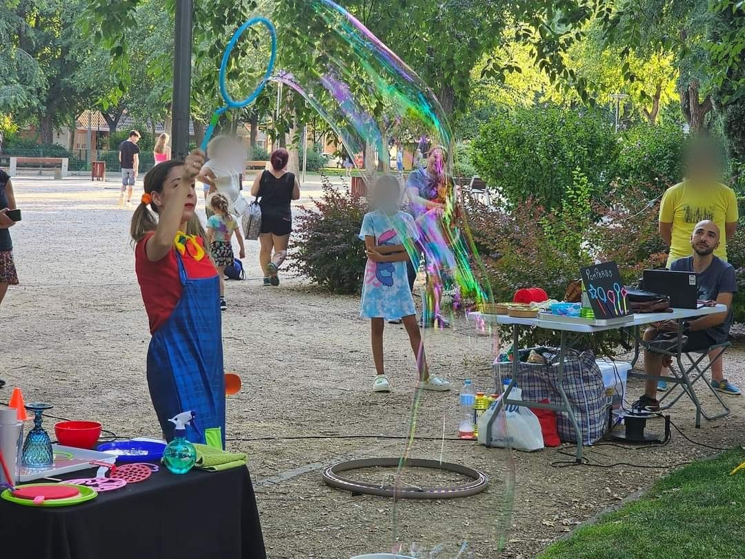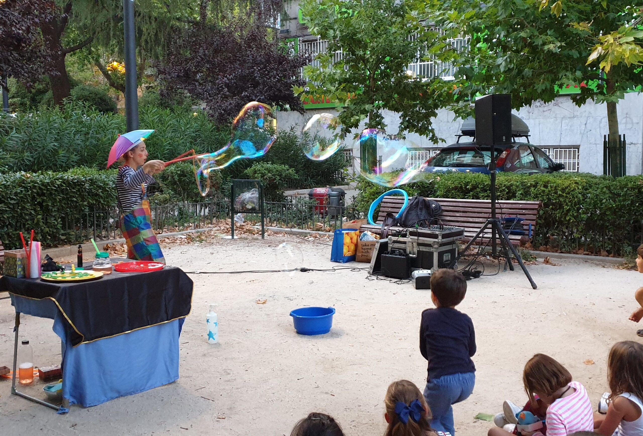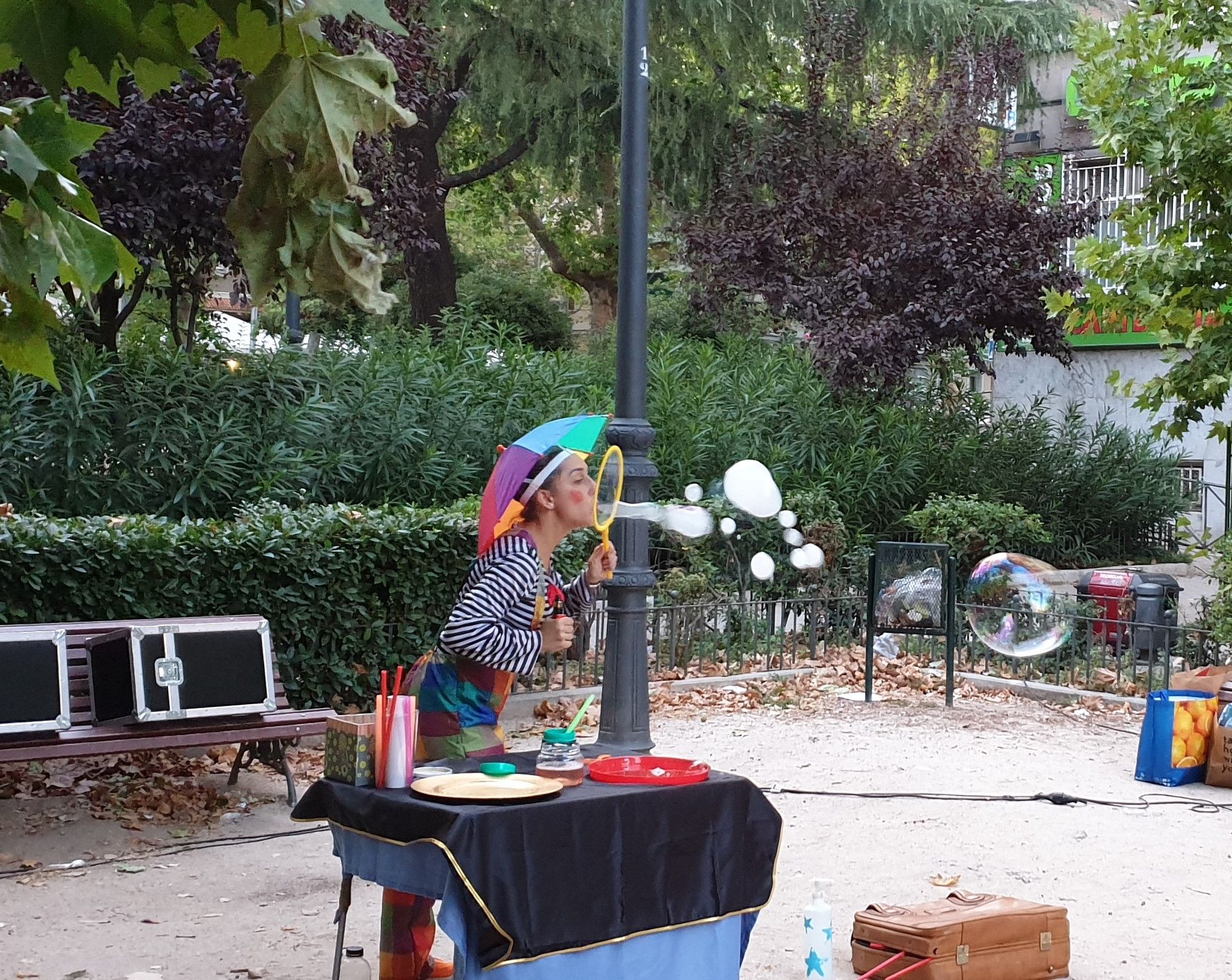 Espectáculo clown mimo musical donde se hace una exhibición de pompas con diversos materiales. Se puede añadir también a continuación del show un taller de pomperos.